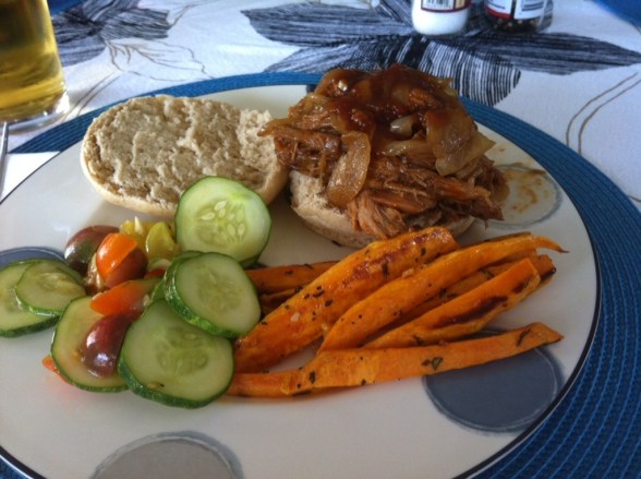 I know I’ve posted something like this before, but this has to be one of my favorite slow meals. I have favorite quick meals – tofu pad thai, french toast, – but for a take-half-the-day-to-make meal, pulled pork sandwiches are right up there.