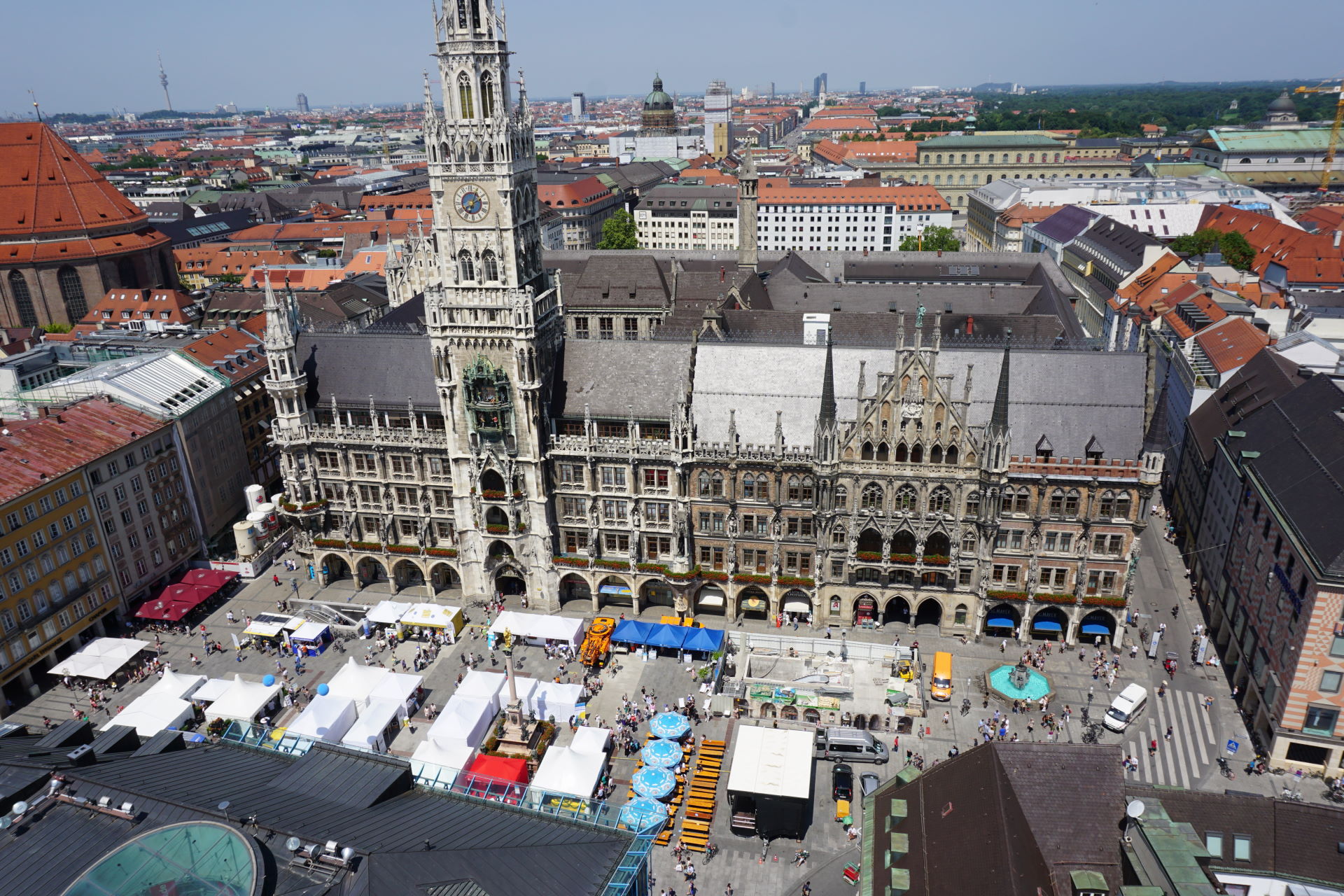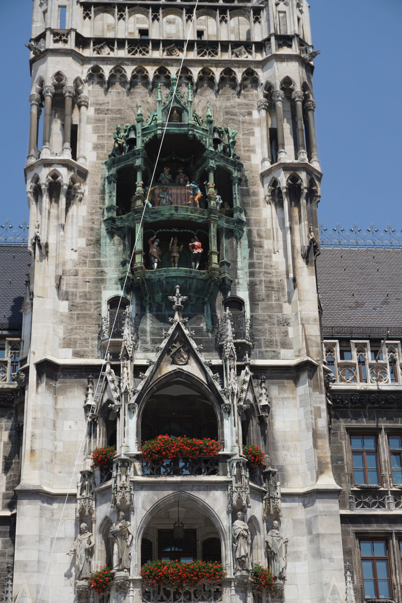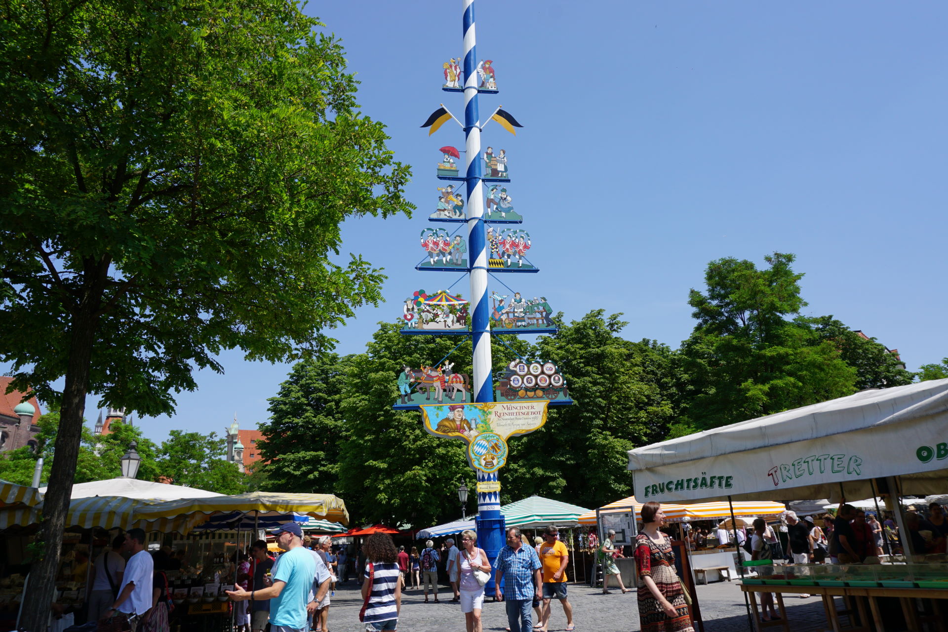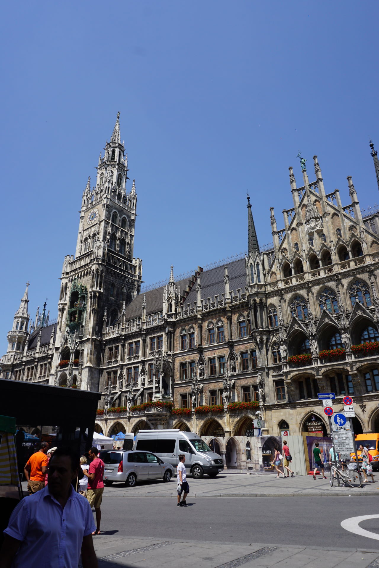 Thankfully Bob can read a map and navigate because my sense of direction is frequently off. We wandered down to the Marienplatz and got our bearings. We had just a few things that we wanted to do this first day – find the market, go up into St. Peter’s Church and maybe walk up to the English Garden. Of course we get to Germany at the start of a heatwave, but we go for it any way. The Viktualienmarkt is huge. There is every kind of vegetable, pastries, food and beer available. We wandered through (I was looking for a chocolate shop) but it was so crowded and hot that we didn’t stop anywhere. We might go back, but for this day, we decided just to look around. From the market we went to the Marienplatz. Again, it was very crowded, but we were able to find something to snack on as we watched the people. We also saw the Glockenspiel.